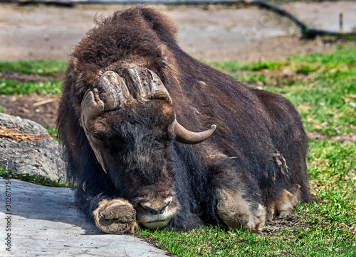 Fototapeta premium Musk-ox on the lawn in its enclosure. Latin name - Ovibos moschatus
