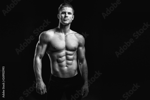 © KDdesignphoto, Fototapeta premium Muskularny model młody człowiek na ciemnym tle. Czarno-biały portret moda silny brutalny facet z nowoczesną modną fryzurą. Seksowny, nagi tors, sześciopak abs. Mężczyzna napina mięśnie. Koncepcja sportu.