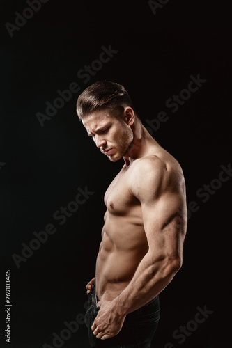 Fototapeta premium Muskularny model młody człowiek na ciemnym tle. Moda piękny portret silnego...