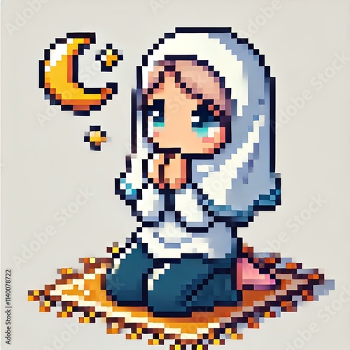 Obraz premium Muslim Girl Praying on White Background in Pixel Style