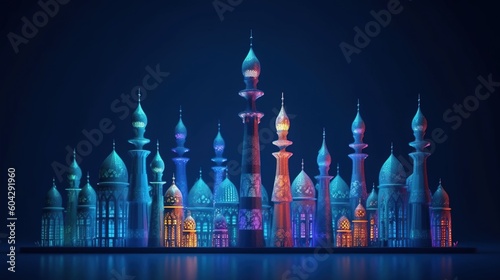 Fototapeta premium Muslim Islamic New Year, religious event. Graphic illustration. Bathed mosques. AI generated.