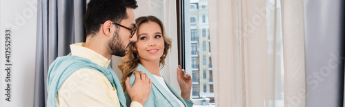 Fototapeta premium Muslim man hugging smiling girlfriend near window in hotel room, banner