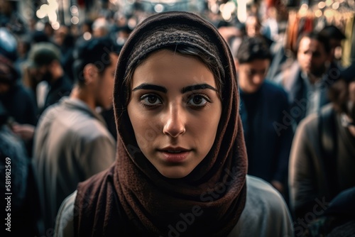Fototapeta premium Muslim woman at a middle eastern city street market looking at the camera. generative AI