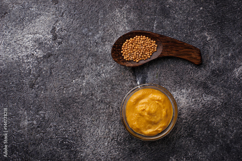 © Yulia Furman, Fototapeta premium Mustard and seeds on concrete background