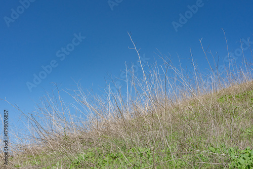 Obraz premium Mutarda nigra, Rhamphospermum nigrum (syns. Brassica nigra and Sinapis nigra), black mustard. Kenneth Hahn State Recreation Area, Baldwin Hills Mountains of Los Angeles California
