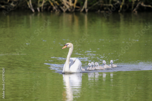 © Kim, Obraz premium Mute swan with cygnets, London, UK
