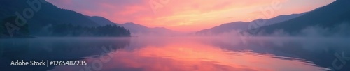 © Sathaporn Buarabut, Fototapeta premium Muted colors of dawn on still lake surface, misty veil, serene, misty, lake