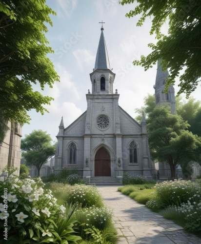 Naklejka premium Muted grey church architecture with lush green foliage and blooming flowers...