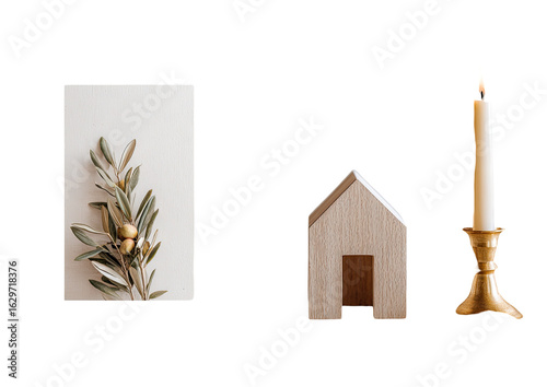 © nur, Naklejka premium Muted tones, still life with simple elements. A sprig of olive branches on off-white background, a small wooden house, and a golden candleholder