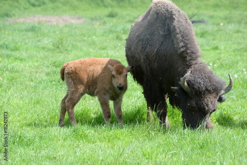 © Grubärin, Fototapeta premium Mutterschutz, kleines Bisonkalb an Mutters Seite