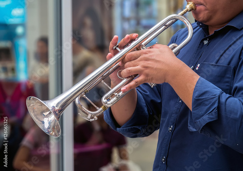 © THANANIT, Obraz premium Muzyk grający na trąbce na świeżym powietrzu