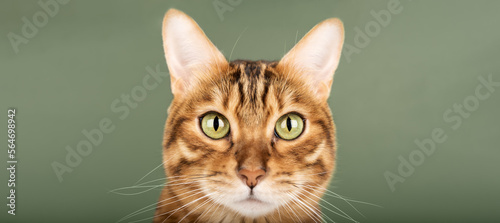 © Svetlana Rey, Obraz premium Muzzle of a Bengal cat with green eyes close-up on a green background.