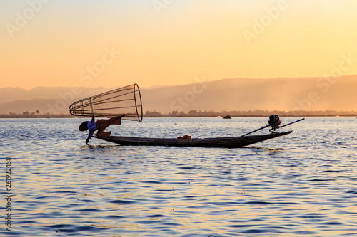 Naklejka premium Myanmar travel attraction landmark - Traditional Burmese fisherman at Inle lake, Myanmar famous for their distinctive one legged rowing style