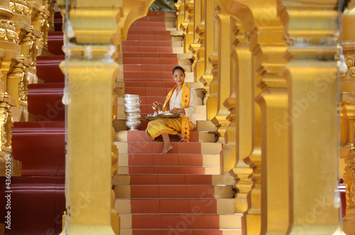 Fototapeta premium Myanmar women holding flowers at a temple. Southeast Asian young girls with burmese traditional dress visiting a Buddihist temple