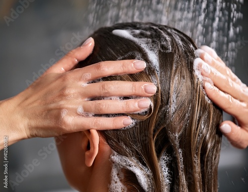 Naklejka premium Mycie włosów szamponem pod prysznicem – codzienna pielęgnacja
