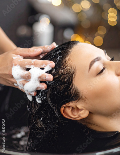 Naklejka premium Mycie włosów w salonie fryzjerskim na myjce