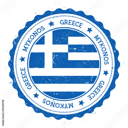 Fototapeta premium Mykonos flag badge. Vintage travel stamp with circular text, stars and island...