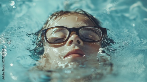 © Soulc, Fototapeta premium Myopia prevention with a child wearing glasses swimming in an outdoor pool. Sports, fitness, and eye health