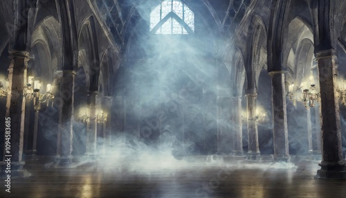 Naklejka premium Mysterious Abstract Renaissance Gothic Hall with Soft Light and Smoky...