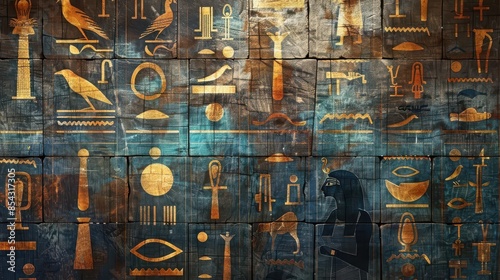 © Bijac, Fototapeta premium mysterious ancient egyptian hieroglyphs on stone wall historic archeology concept illustration