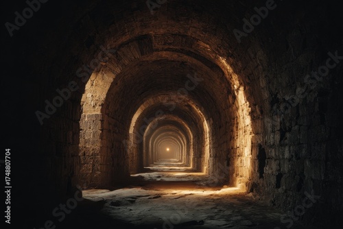 © WHO, Fototapeta premium Mysterious Ancient Stone Tunnel With Golden Light At The End