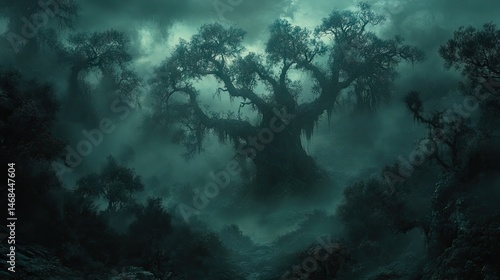 Obraz premium Mysterious, ancient trees in a dense, misty forest.