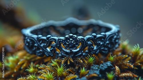 © Matus, Fototapeta premium Mysterious Antique: Intricate Black Ring in Moody Lighting, generative ai