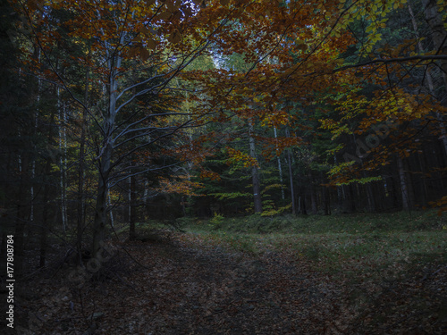 © Kristyna, Obraz premium mysterious autumn forest road in the dusk dim light with orange beech tree