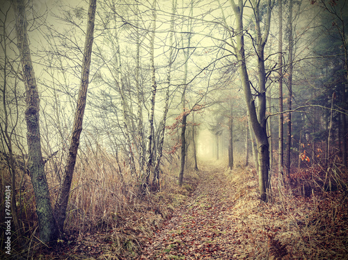 Obraz premium Mysterious autumnal forest in a foggy day.
