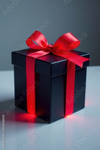 © Sethee, Obraz premium Mysterious black gift box, vibrant red neon ribbon , still life, object, anniversary