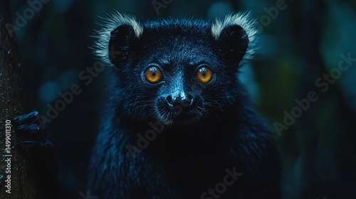 Naklejka premium Mysterious black lemur with intense, glowing amber eyes staring from the...