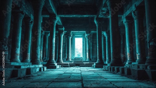 Fototapeta premium Mysterious blue-lit corridor in an ancient stone structure with rows of majestic columns, leading to a bright exit evoking a sense of lost civilizations, timeworn beauty, and hidden wonder