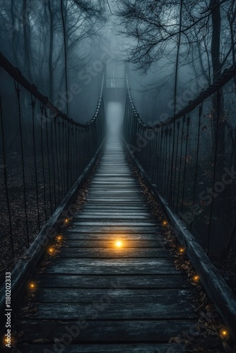 Obraz premium Mysterious bridge illuminated by glowing orbs, surrounded by fog