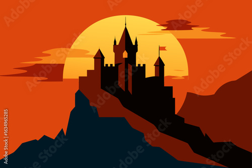 Fototapeta premium Mysterious castle silhouette against a dramatic sunset sky