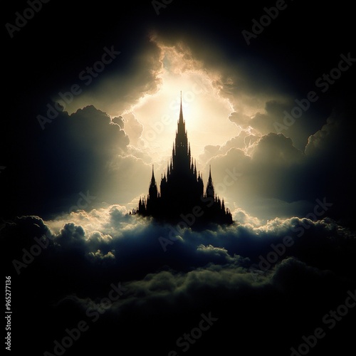 Fototapeta premium Mysterious castle towers above dark clouds illuminated by ethereal light at...