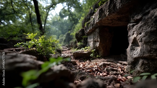 Fototapeta premium Mysterious cave hidden within a lush forest landscape