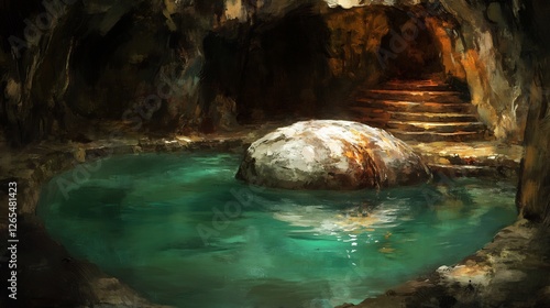 © heinng, Fototapeta premium Mysterious Cave Pool Dark Emerald Water Serene Stone Ancient Steps. AI Generated