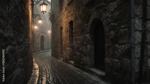 Fototapeta premium Mysterious Cobblestone Alleyway at Night with Gas Lamps.