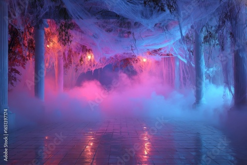 © Sami, Naklejka premium Mysterious corridor filled with fog and glowing neon fabric / Abstract hall with mist, blue fabric ceiling and pink light glow