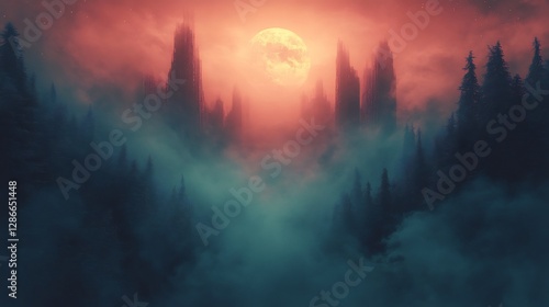© heinng, Fototapeta premium Mysterious crimson moon dramatically lights foggy forest valley. AI Generated