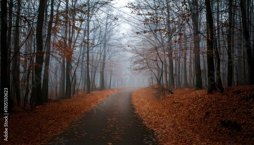 © blackdiamond67, Fototapeta premium Mysterious Dark Autumn Forest In Fog With Road, Trees And Branch