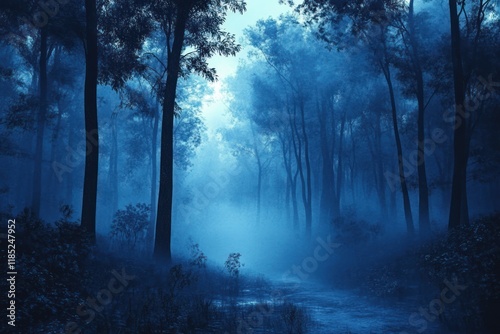 Naklejka premium Mysterious Dark Blue Forest Enshrouded in Fog with Tall Trees and Ethereal Lighting