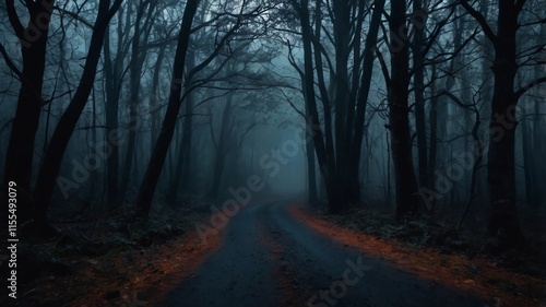 Naklejka premium Mysterious dark forest. dark and moody forest road covered in mist. halloween...
