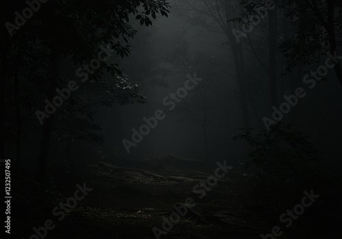 © Octopus16, Fototapeta premium Mysterious Dark Forest Path Enveloped in Fog