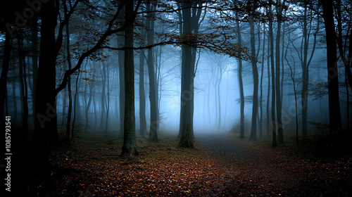 Obraz premium Mysterious dark forest shrouded in fog with towering trees and a winding path...