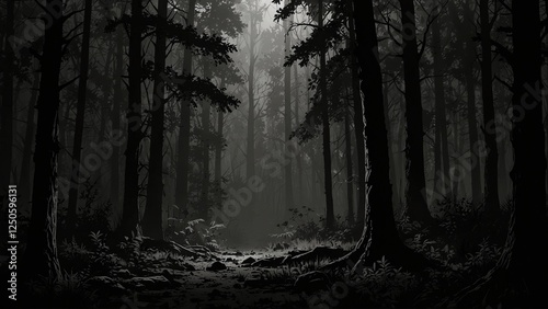 Naklejka premium Mysterious dark forest with fog and shadows creating eerie atmosphere