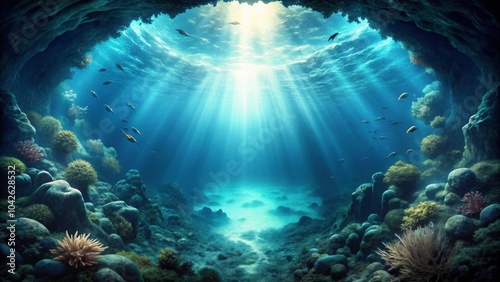 Fototapeta premium Mysterious, dark ocean abyss filled with unknown creatures and secrets,...