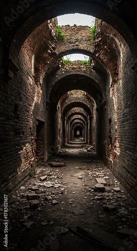 © Eatu, Fototapeta premium Mysterious Decaying Arched Hallway in an Abandoned Ancient Fortress.