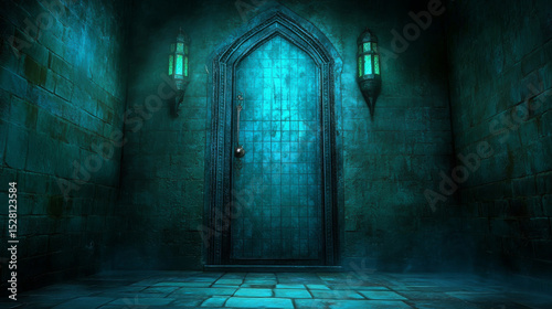 Obraz premium Mysterious door dimly lit corridor, surrounded by stone walls and glowing lanterns