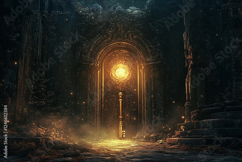 © Oleksandr, Obraz premium Mysterious door opening to a starry night with two moons illuminating the path in a fantasy landscape